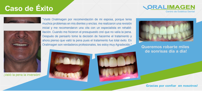 "Visité Oralimagen por recomendación de mi esposa porque tenia muchos problemas con mis dientes y encías. Me realizaron una revisión inicialmente y me recomendaron una cita con una especialista en Rehabilitación. Cuando me hicieron el presupuesto crei que no valía la pena. Despues de pensarlo tomé la desición de haceme el tratamiento y ahora pienso que valió la pena, pues el tratamiento fue total éxito.